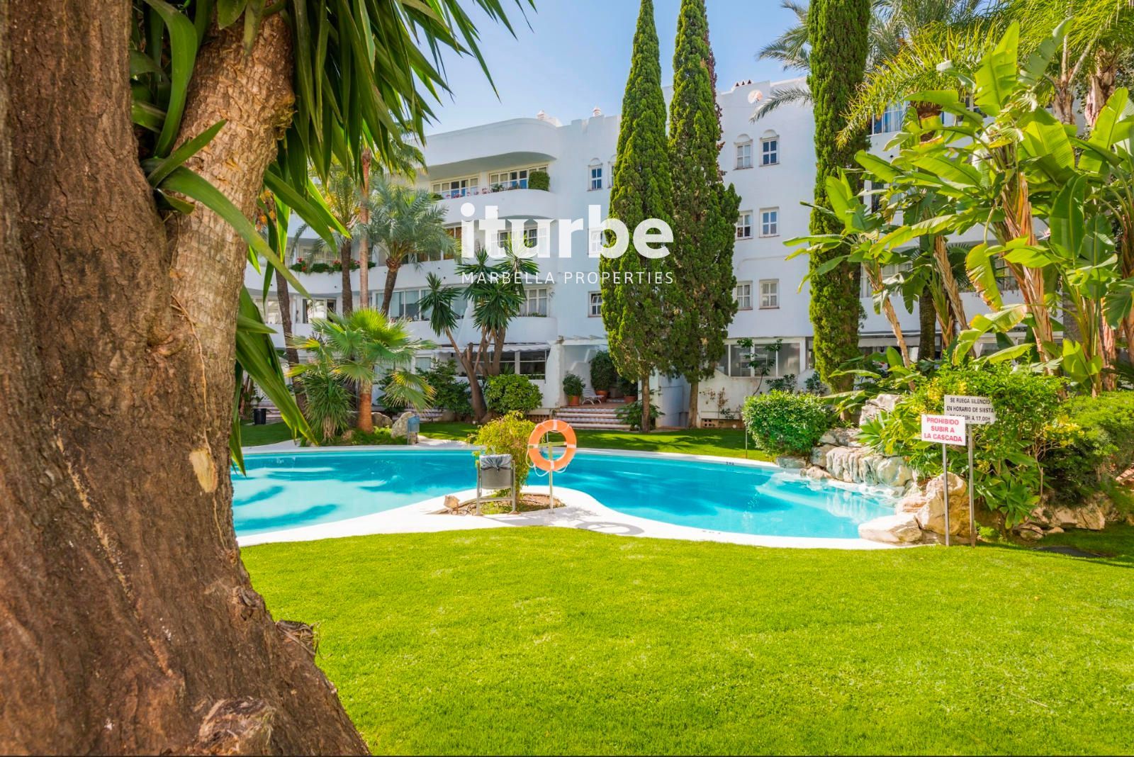 Bonito y acogedor piso a 300 metros del Mar, ubicado en la urbanización Marbella Real en el corazón de la milla de oro en la salida de Marbella hacia Puerto Banus. Vivienda con orientación al sur. Desde las dos terrazas de la vivienda tenemos bonitas vistas a las zonas comunes de la urbanización y a una piscina con cascada. La vivienda destaca por su amplio salón-comedor, su buen estado de conservación, ausencia total de ruidos, grandes armarios en dormitorios y salón, suelos y baños de mármol, amplia y luminosa cocina, carpintería de madera actualizada, aire acondicionado frio/calor y fibra óptica. La vivienda incluye una plaza de garajey un solárium privado en la cubierta de más de 30m2.